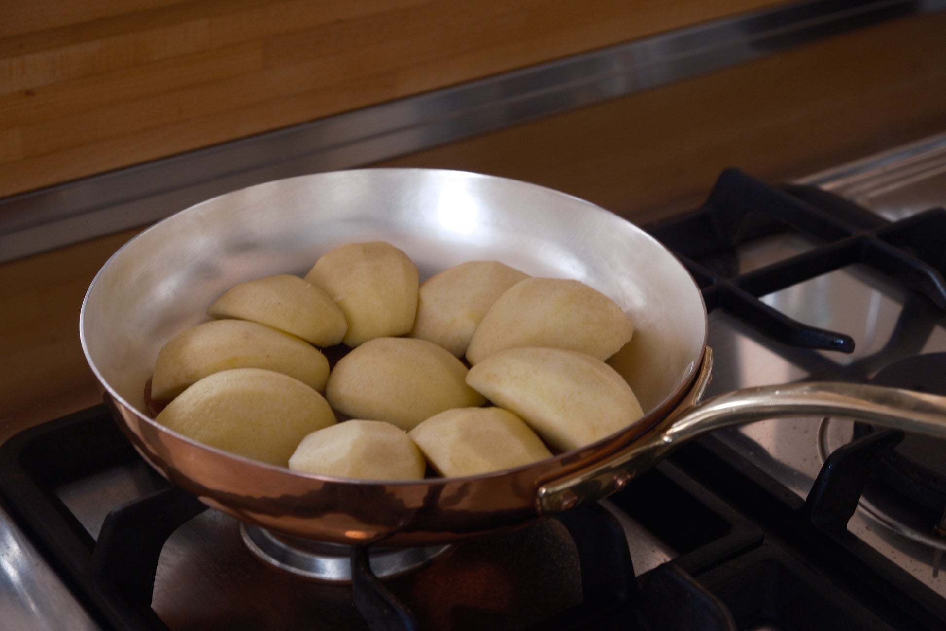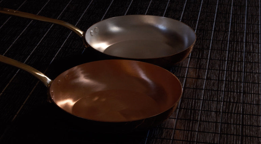 Hand-made Copper pan lined in silver, 26cm diameter, brass handle hand-made. Hand wash only. Not dishwasher safe.